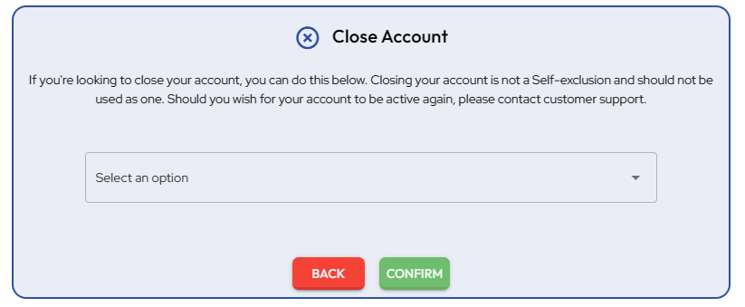 If you're looking to close your account, you can do this by following the steps below. Closing your account is not a Self-exclusion and should not be used as one. Should you wish for your account to be active again, you need only contact our Customer Support Team.